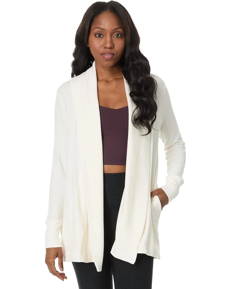 - Softness that hugs your soul in the Beyond Yoga® Relax Rib Cardigan. Made from ultra-soft fabric with ribbed detailing on the neckband, hem, and cuffs, this open-front cardigan offers a perfect blend of comfort and style. The classic fit, long sleeves, and upper-thigh length make it ideal for lounging or layering over casual outfits. With convenient on-seam side pockets to keep your essentials close, it’s the perfect companion for your morning coffee, midday errands, or unwinding at night.