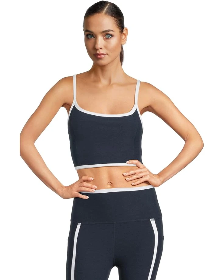 - Get an alluring look and enjoy that next-to-skin, luxurious feel during your workout or yoga sessions by opting for the Beyond Yoga® Spacedye New Moves High Cropped Tank Top. It features a sleeveless design with a soft square neckline and back, self shelf bra, contoured hem, and princess seams. With the contrast binding on neckline, armholes, and hem, this fitted top looks appealing.