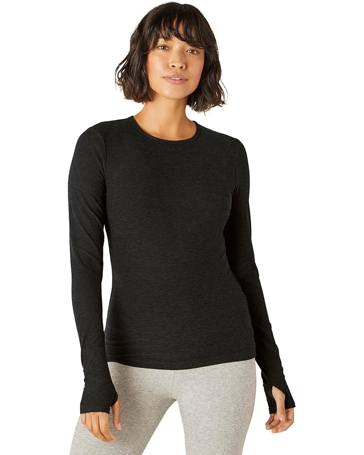 - Crafted from buttery soft performance fabric with a unique texture, the Beyond Yoga® Spacedye Classic Crew Pullover keeps you warm and comfortable on the coldest days. The fabric wicks away moisture easily and protects you from harmful UV rays. The stretchable sweatshirt features a crew neckline, long sleeves with thumbholes, and a straight hemline.