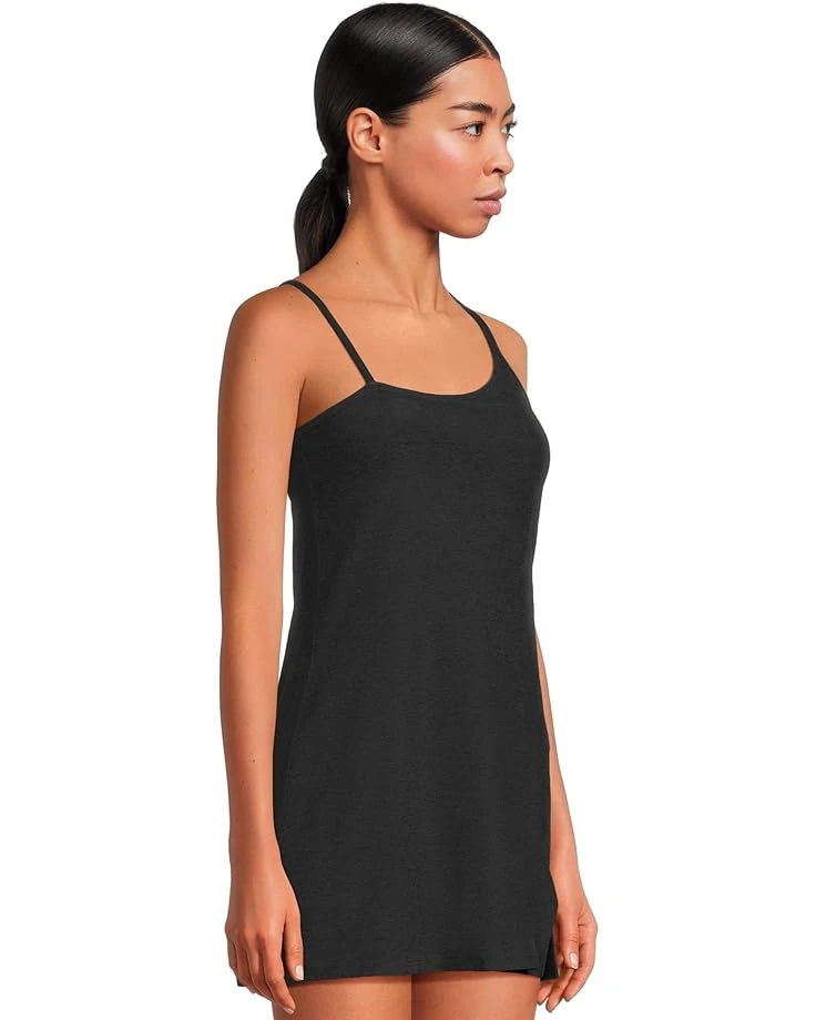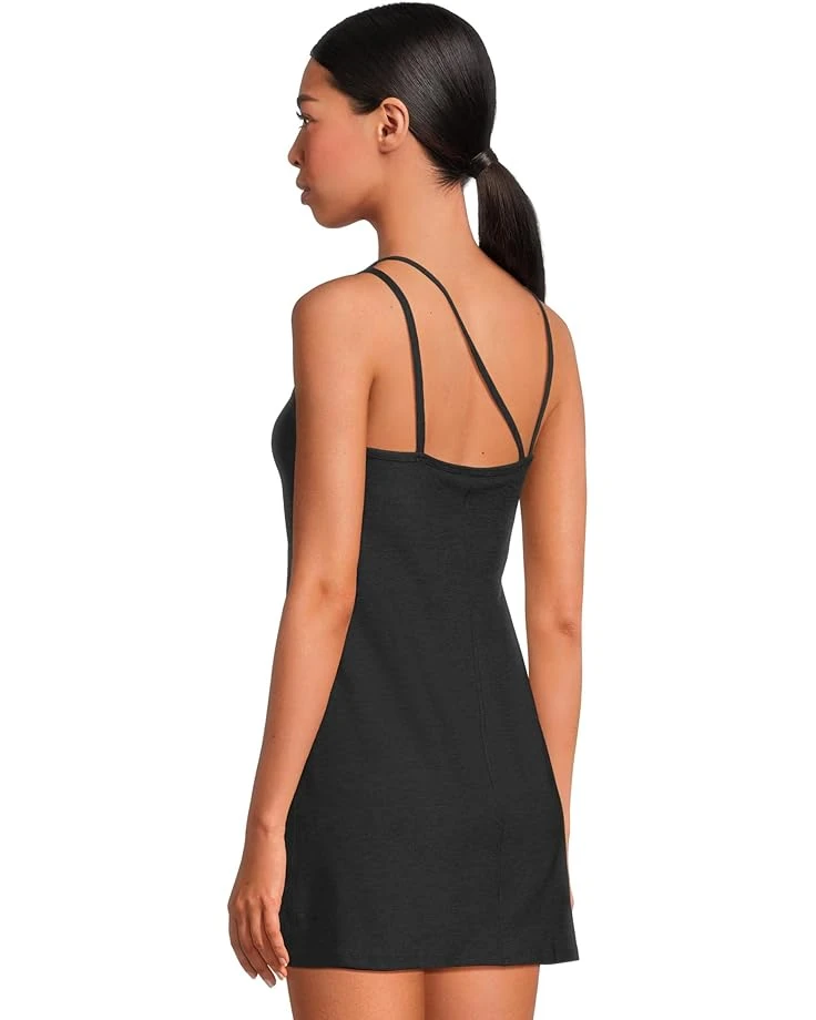 - The Beyond Yoga® Spacedye Fearless Mini Dress is a mini dress with an active lifestyle in mind: hidden built-in shorts (with pocket) cover your workout dress needs for sports like tennis and pickleball. You loved the asymmetrical neckline so much, it is designed into a dress that can go from workout to out and about. The best part? This style features a comfy hidden bodysuit inside that has pockets for your phone, cards, or keys. This sleeveless dress is styled with self-spaghetti straps, a side slit, and a straight hem. On days when your plans are about being socially active instead, this flattering dress serves as the perfect throw-on-and-go mini dress for spending the afternoon at the farmer’s market before grabbing a bite to eat.