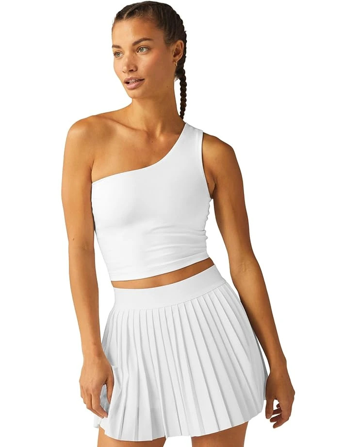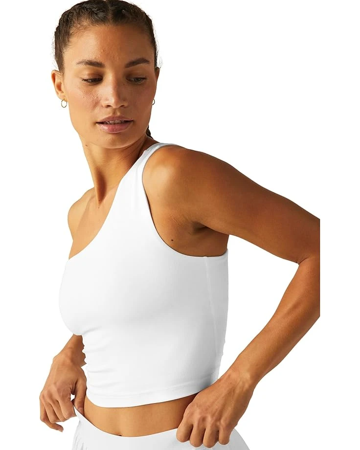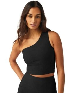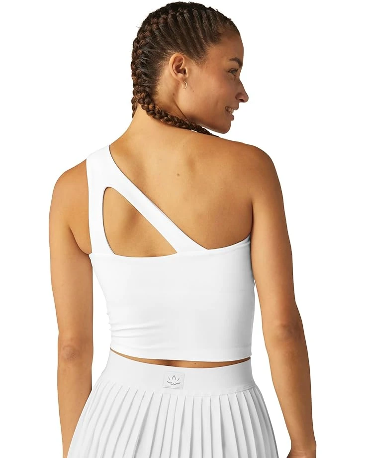 - Own your power, move with freedom styling Beyond Yoga® Spacedye The Bold Shoulder Cropped Tank! Flaunt the wide one-shoulder and back cut-out for a stylish statement. Enjoy sleeveless freedom and medium support with a built-in shelf bra. Perfect for yoga, pilates, or a game of tennis, this fitted tank transitions seamlessly from workout to night out.